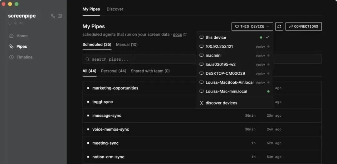 3.Pipes:真正的杀手级功能——AI代理替你干活 这才是Screenpipe最骚的地方。 你在~/.screenpipe/pipes/里扔一个pipe.md markdown文件,写好YAML前置 + Prompt + 调度(cron),它就自动跑。 内置例子: