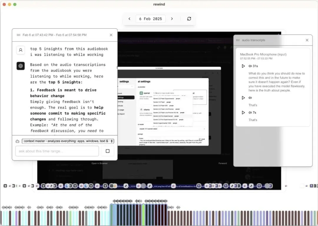 2.自然语言搜索 + 时间线回放,像DVR一样刷历史 想找“上周二跟产品聊的那个定价方案”?直接打字查询,它秒吐截图+音频片段+OCR文本。支持过滤app、窗口、URL、日期,还带embedding语义搜索。 时间线界面超级丝滑,像刷抖音一样左右滑,点哪看哪,音频还能直接播放。忘事党福音!