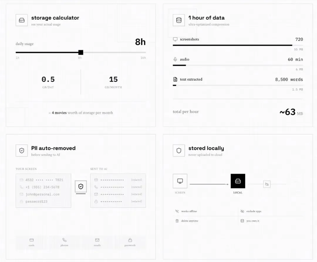 1.事件驱动截图 + 音频转录,省电又精准 它不是傻傻每秒录视频(那得吃多少资源),而是监听OS事件:切应用、点击、打字暂停、滚动……只有“有变化”才截一张图,同时抓取系统的accessibility tree(结构化UI文本)。没tree的场景(游戏、远程桌面)自动 fallback OCR。 音频同时录系统声+麦克风,用本地Whisper实时转录,还带说话人识别和diarization。Zoom、Teams、Google Meet全通杀。 结果?CPU只占5-10%,一个月才5-10GB存储(比传统录屏省90%+)。