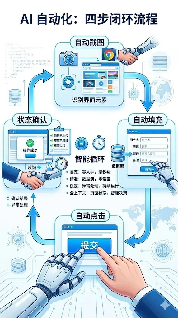 - ✅ 自动截图:AI 实时捕获浏览器画面,通过视觉能力分析 UI 布局
