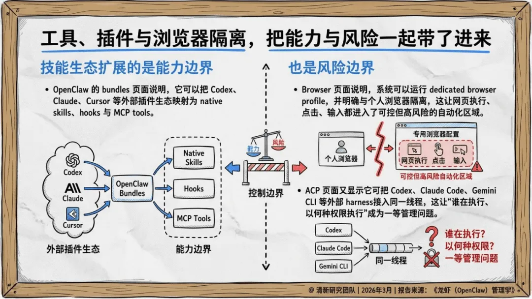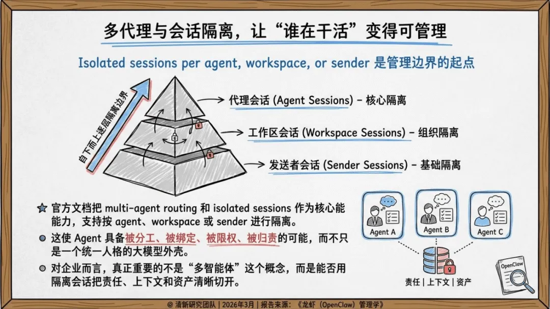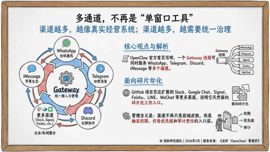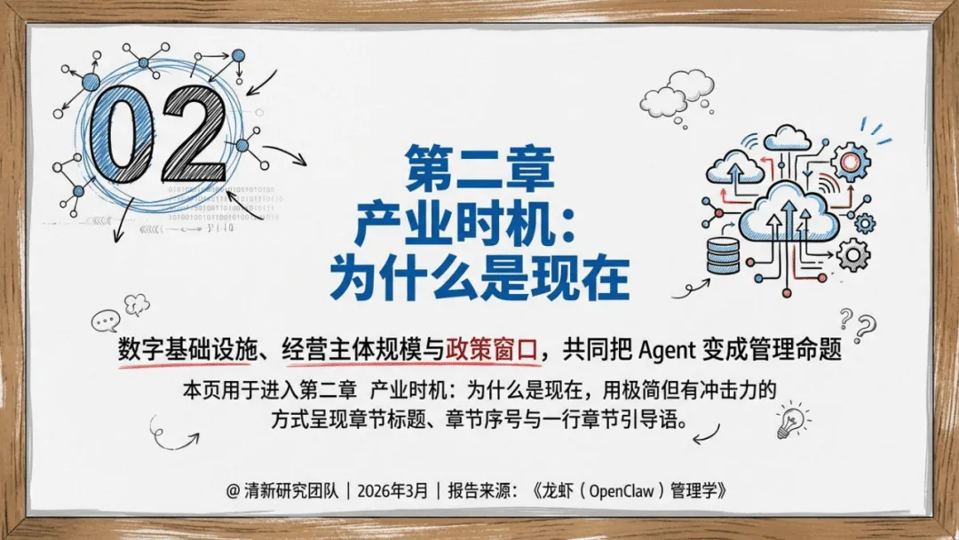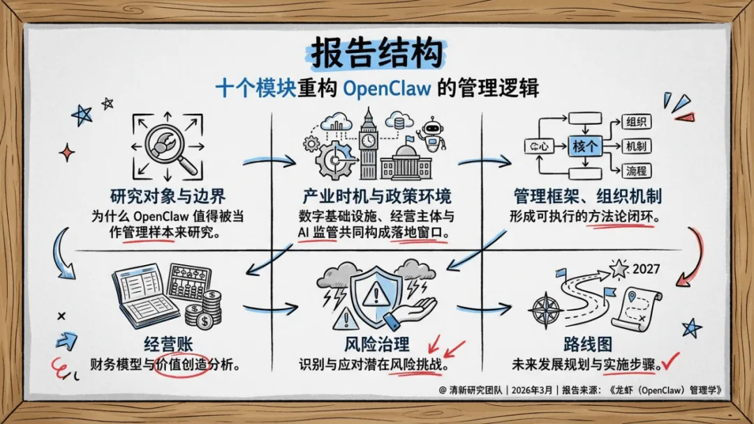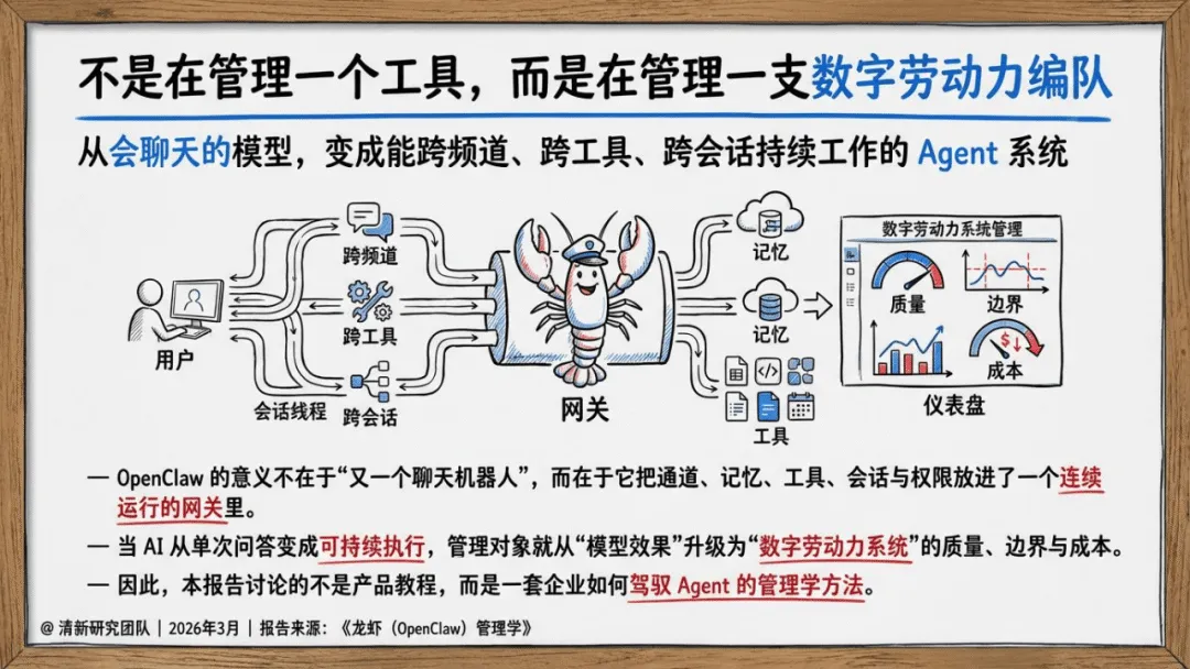 《龙虾(OpenClaw)管理学》聚焦AI Agent时代企业组织设计、流程治理与经营控制,核心是将AI Agent作为数字劳动力编队管理,而非单纯工具。OpenClaw作为多通道、跨工具、长会话的网关系统,成为AI Agent管理的典型样本,其管理核心在于边界、权限、记忆与责任界定。报告提出八层管理模型,覆盖战略、通道、流程等维度,明确先建边界再放自治、先梳理流程再谈智能的部署逻辑。还原创壳内自治、双钳分工等五大核心概念,给出前90天试点、180天角色化部署的落地路线,主张从高频低风险流程切入,沉淀技能、知识库等企业资产,以经营指标衡量价值,推动AI Agent从技术试点转化为稳定经营系统,适配企业数字化与智能化转型需求。