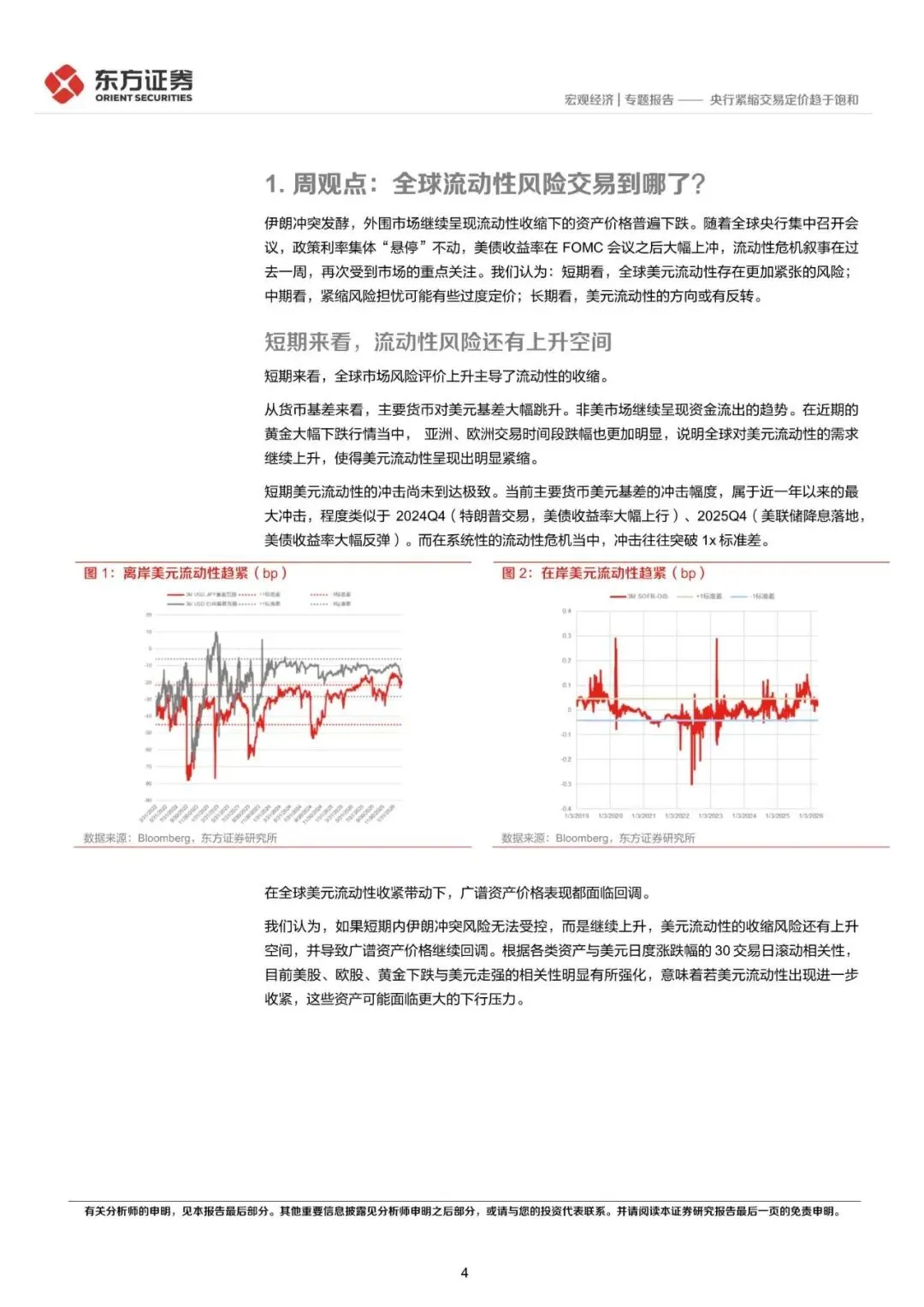 伊朗冲突发酵,外围市场继续呈现流动性收缩下的资产价格普遍下跌。随着全球央行集中召开会议,政策利率集体“悬停”不动,美债收益率在 FOMC 会议之后大幅上冲,流动性危机叙事在过去一周,再次受到市场的重点关注。我们认为:短期看,全球美元流动性存在更加紧张的风险;中期看,紧缩风险担忧可能有些过度定价;长期看,美元流动性的方向或有反转。