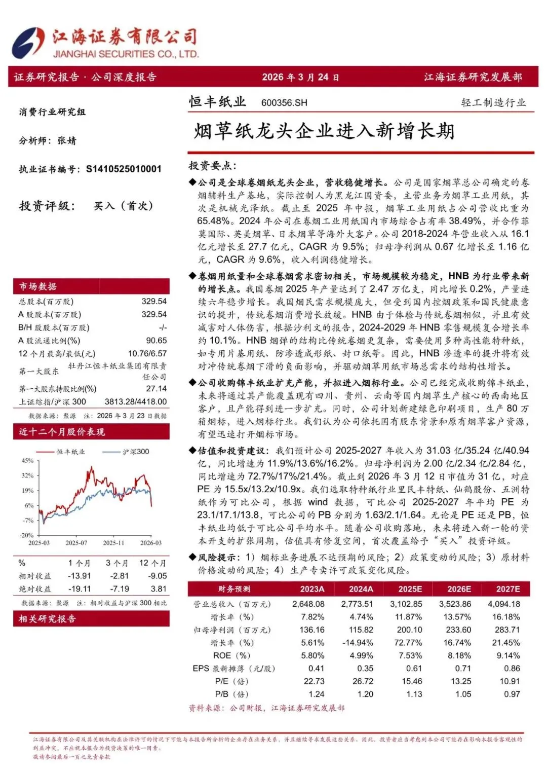 恒丰纸业(600356)烟草纸龙头企业进入新增长期-260324-江海证券-23页