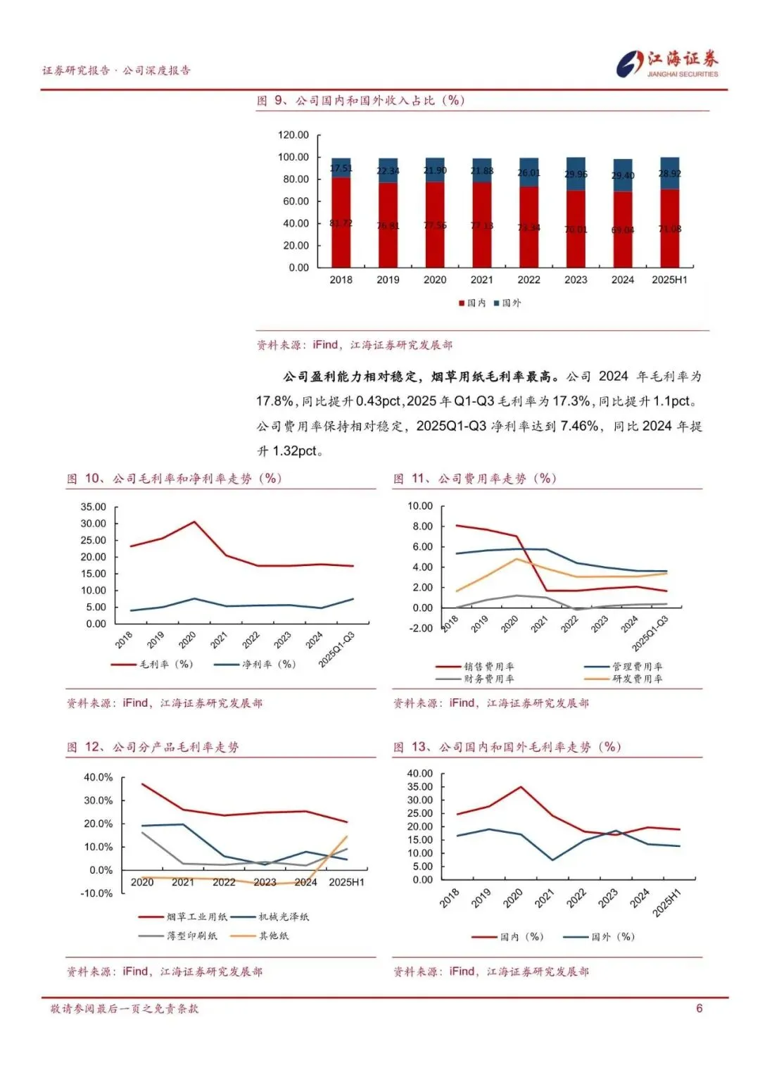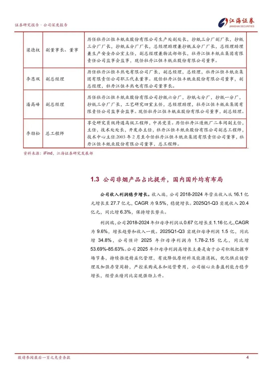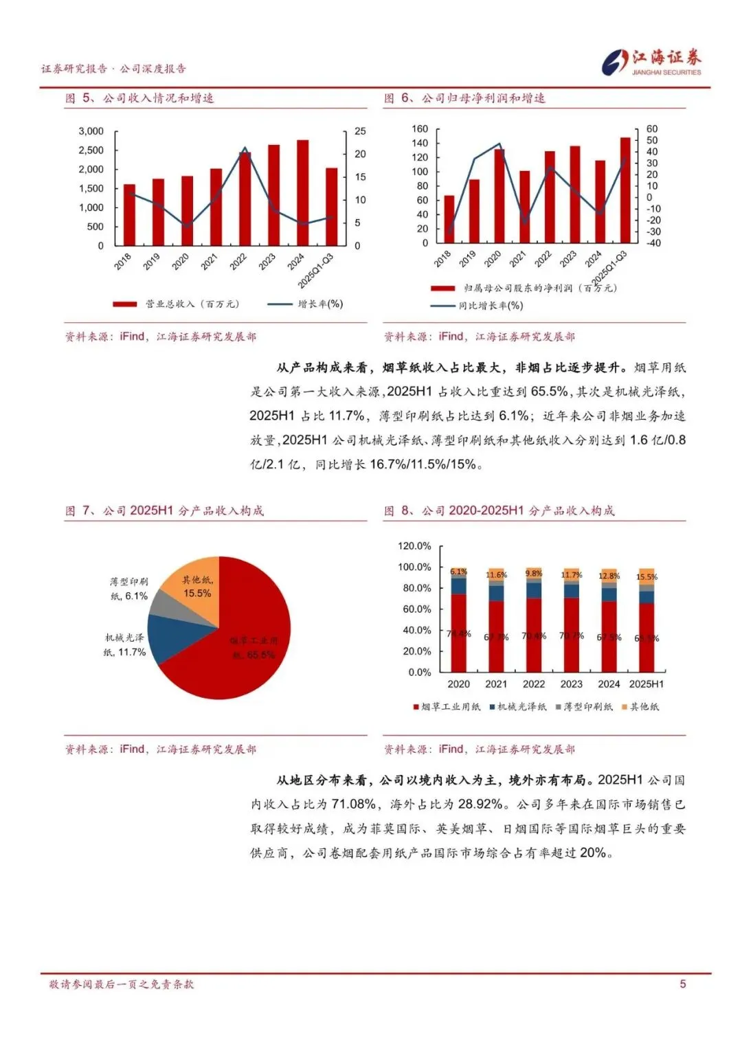 公司是全球卷烟纸龙头企业,营收稳健增长。公司是国家烟草总公司确定的卷烟辅料生产基地,实际控制人为黑龙江国资委,主营业务为烟草工业用纸,其次是机械光泽纸。截止至 2025 年中报,烟草工业用纸占公司营收比重为65.48%。2024 年公司在卷烟工业用纸国内市场综合占有率 38.49%,并合作菲莫国际、英美烟草、日本烟草等海外大客户。公司 2018-2024 年营业收入从 16.1亿元增长至 27.7 亿元,CAGR 为 9.5%;归母净利润从 0.67 亿增长至 1.16 亿元,CAGR 为 9.6%,收入利润稳健增长。