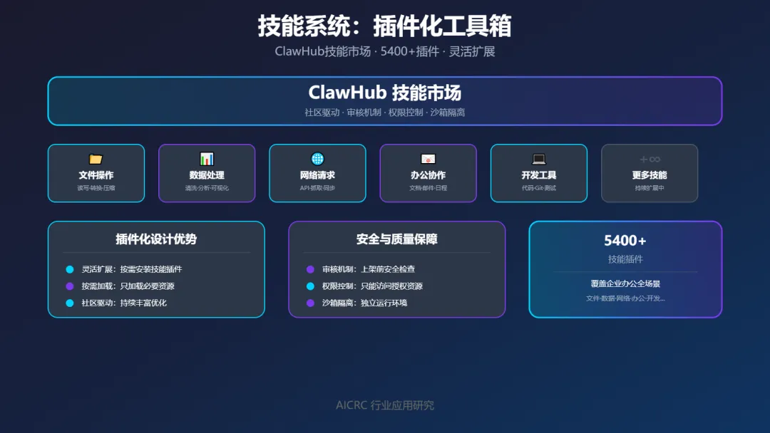 灵活扩展: 需要新能力?安装对应的技能插件就行,不需要修改系统核心。