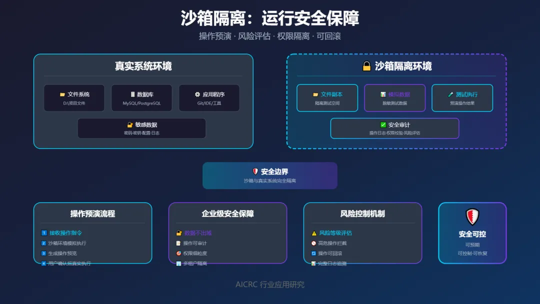 沙箱就像一个"隔离舱",AI在这个舱内执行操作,即使出了问题,也不会影响到外面的真实世界。
