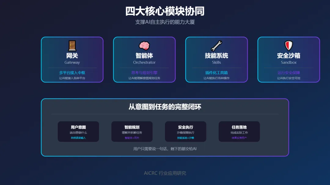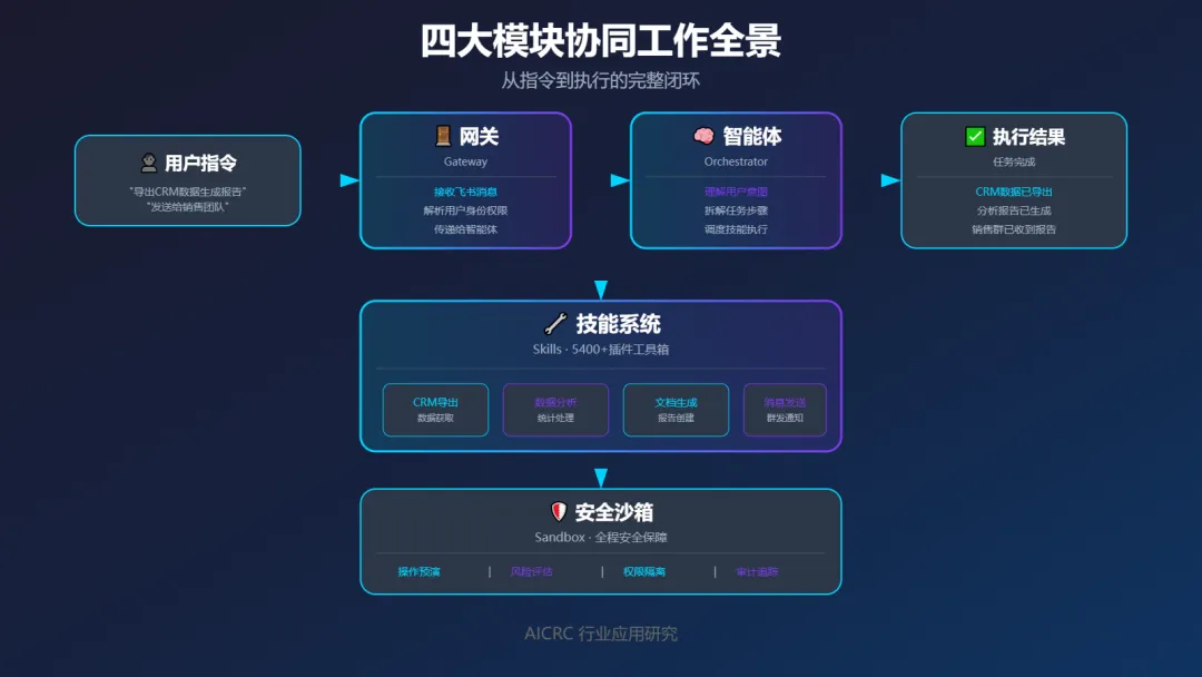 整个过程,四大模块紧密协作:网关负责接入,智能体负责规划,技能负责执行,沙箱负责安全。