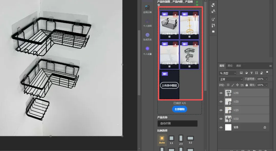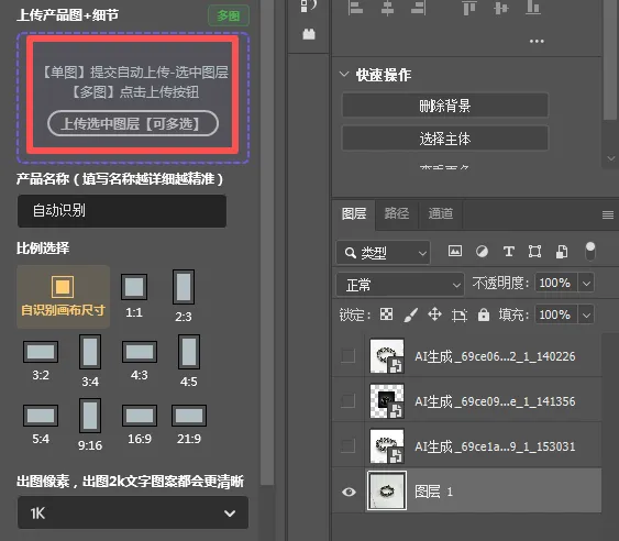 多张图片:需要在图层面板中全部选中要处理的图层,再点击窗口的上传按钮