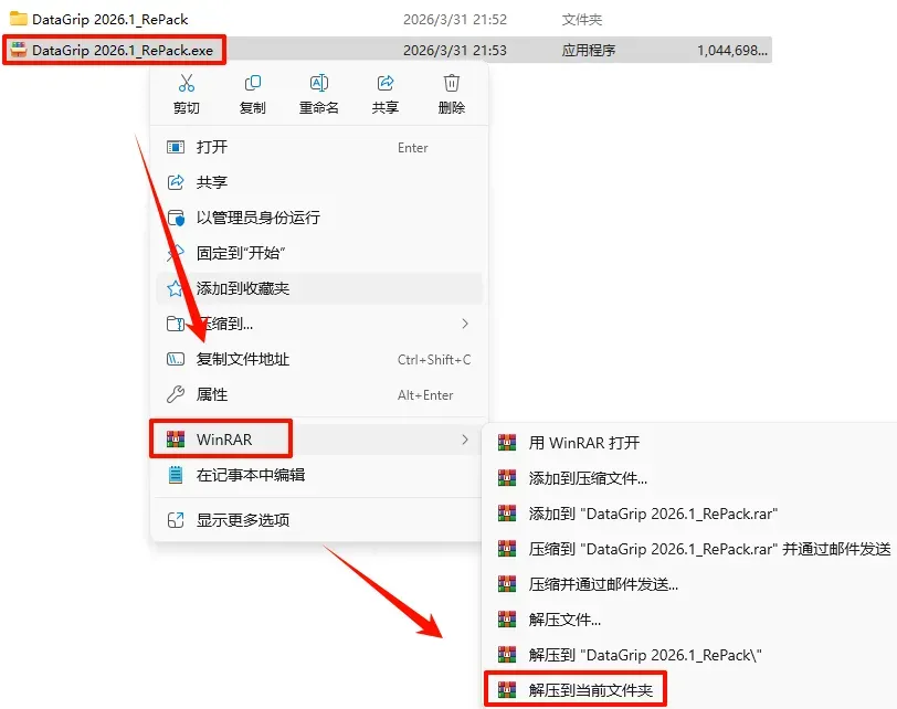 2.打开刚刚解压的文件夹,鼠标右键点击“DataGrip_2026.1_x64-(IDE`a).exe”选择“以管理员身份运行”