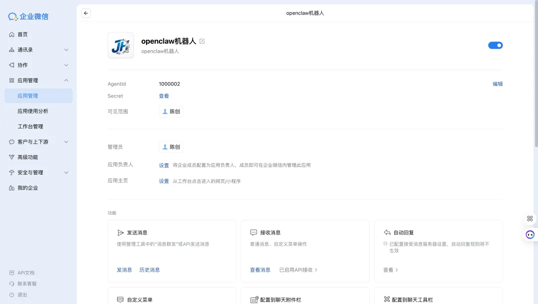 // 企业微信(自建应用 - 接收消息 + 应用 Secret)const WEWORK_TOKEN = '<YOUR_WEWORK_TOKEN>';const WEWORK_ENCODING_AES_KEY = '<YOUR_ENCODING_AES_KEY>'; // 43 位,与后台完全一致const WEWORK_CORP_ID = '<YOUR_CORP_ID>';const WEWORK_AGENT_ID = '<YOUR_AGENT_ID>';const WEWORK_SECRET = '<YOUR_APP_SECRET>';// OpenClaw 网关(与 openclaw.json 中 gateway 一致)const OPENCLAW_HOST = '127.0.0.1';const OPENCLAW_PORT = 18789;const OPENCLAW_TOKEN = '<YOUR_OPENCLAW_GATEWAY_TOKEN>';// 长消息分段(企业微信单条文本 ≤2048 字节,多段时加「(1/3)」前缀)const WEWORK_TEXT_MAX_BYTES = 2048;const WEWORK_SEGMENT_PREFIX_RESERVE_BYTES = 20;POST 消息会先校验 msg_signature 再解密;解密失败时日志会提示检查 EncodingAESKey 是否与企业管理后台「接收消息」配置一致。