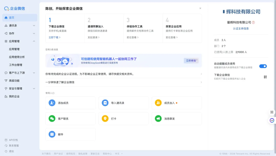 使用管理员账号登录企业微信管理后台。