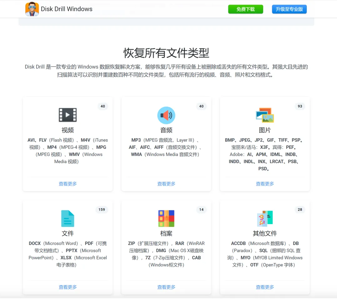 Disk Drill 是一款特别强大的数据恢复软件,它支持多种文件格式,比如说 NTFS,FAT32、EXT、HFS 加等各种文件系统它不仅支持硬盘,还支持外置的SD 卡和U 盘等等它支持快速扫描和深度扫描,可以轻松恢复你被删除的数据扫描的内容,它会按照图片、视频、音频、文档等等各种文件格式分别区分开,你可以选择恢复想要恢复的内容,特别的方便快捷之前的相机储存卡数据就恢复了,基本上没有丢失内容同时支持Windows 和Mac