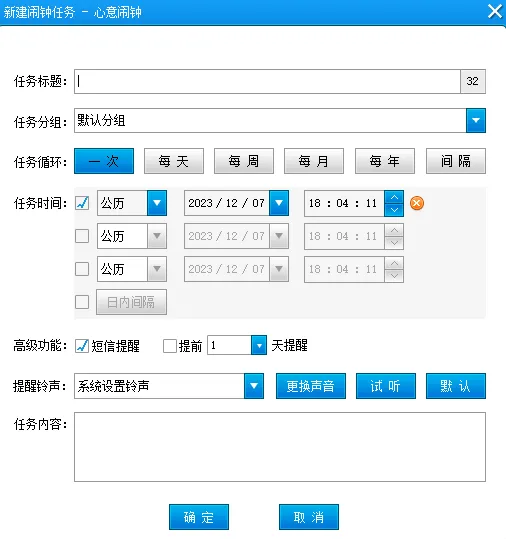 设置闹钟只需进入闹钟界面点击新建,填写标题、分组、循环、时间、高级功能及铃声等信息即可完成配置。