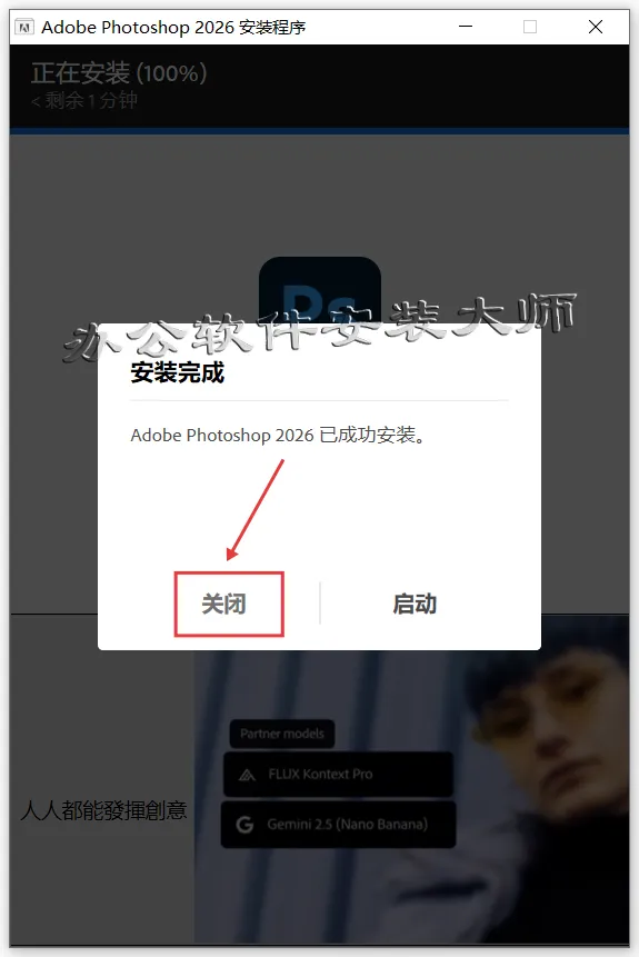 5.显示Photoshop 2026安装完成后点击【关闭】。