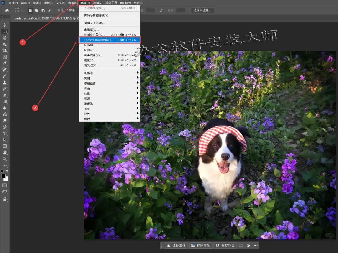 进入Photoshop软件界面,点击上方菜单栏【滤镜】展开,再点击【Camera Raw滤镜...】即可打开使用。