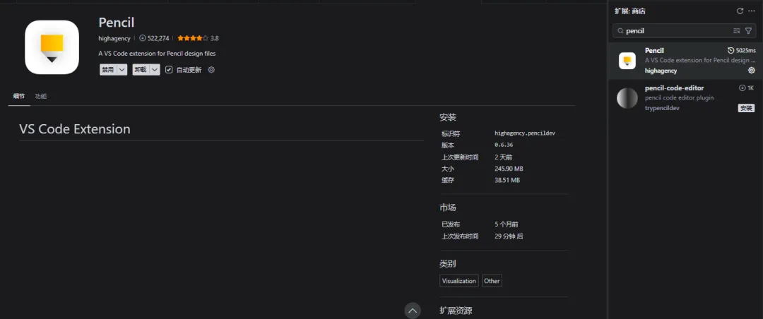- 在插件市场搜索 Pencil 并安装 - 找到路径