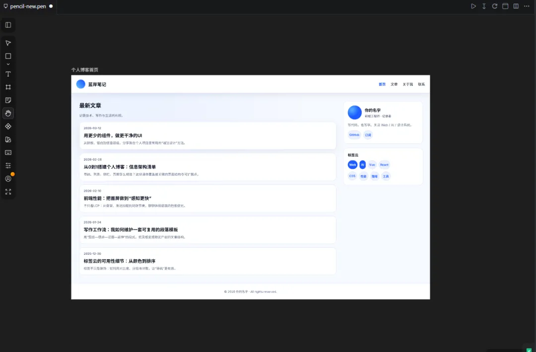 使用pencil 帮我设计一个个人博客首页,要求:1. 顶部有导航栏(首页、文章、关于我、联系)2. 中间是文章列表,每篇文章显示标题、摘要、发布日期3. 右侧有个人简介和标签云4. 底部有版权信息5. 整体风格简洁现代,主色调用蓝色