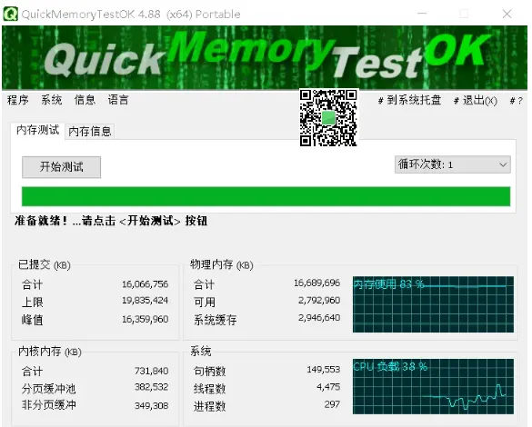 QuickMemoryTestOK是一款简单好用的内存测试工具,软件可以帮助您分析当前的内存设备是否有缺陷,可以分析内存参数是否和商家描述的一样,比如可存储容量,负载,速度等参数,同时还能了解CPU的使用情况。