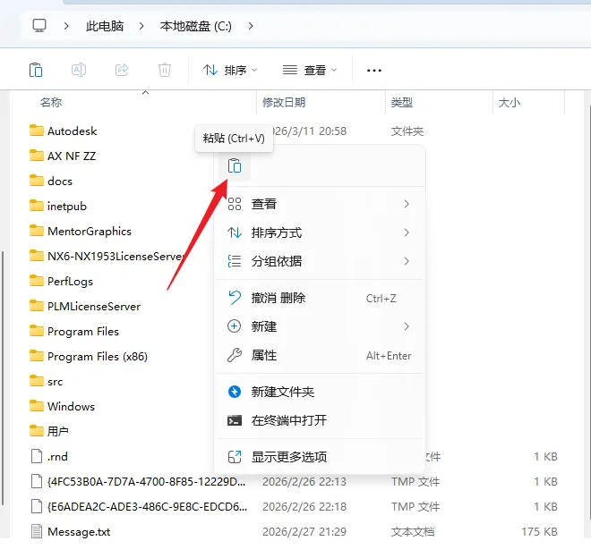 7. 打开电脑C盘,鼠标右击空白处选择【粘贴】。