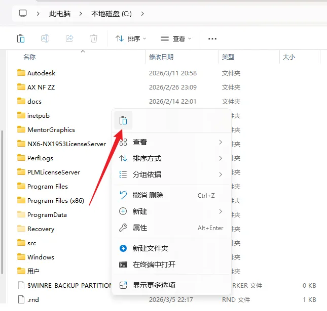 17.打开电脑C盘,鼠标右击空白处选择【粘贴】。