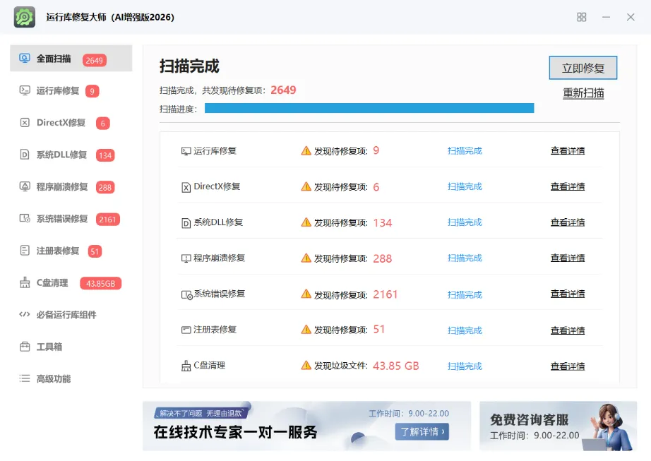 大家要放弃从不明网站下载DLL文件的危险习惯,以防电脑出现的故障变得更大。更推荐电脑小白选择专业的修复工具,特别是运行库修复大师(Ai增强版),它能智能诊断问题的根源,会从官方安全库获取正确的文件,一键完成修复,真正实现“治本”。