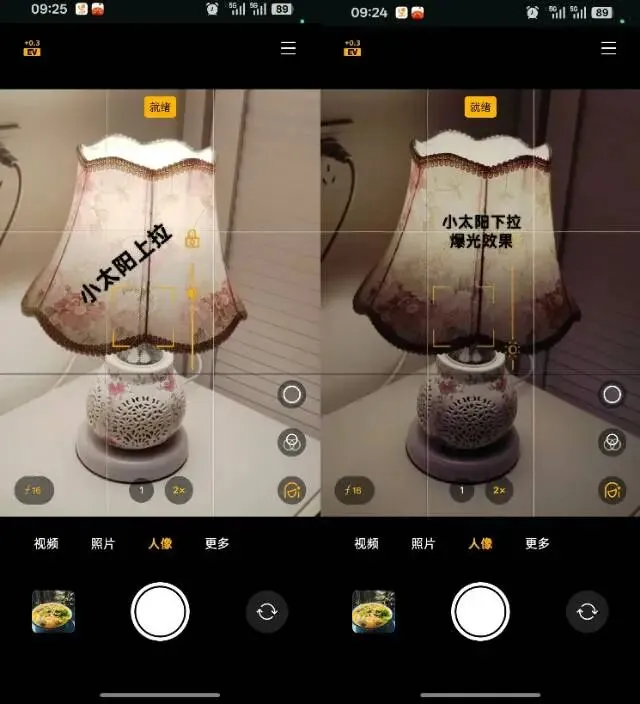拖动小太阳:点屏幕主体对焦后屏幕旁出现的“小太阳”是曝光补偿。宁欠一点,勿过亮了,往上滑是提亮;往下滑是压暗画面
