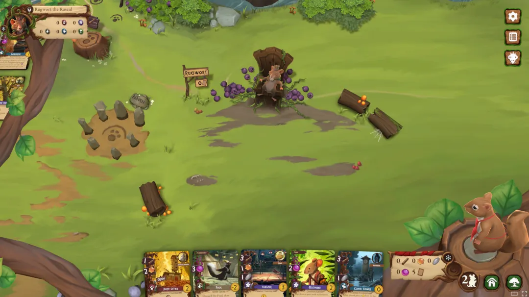 1)放置工人。派遣你的一名得力工人前往山谷收集资源!浆果、树枝、树脂、鹅卵石……当然还有卡牌!你需要它们来帮助你的新文明发展壮大。