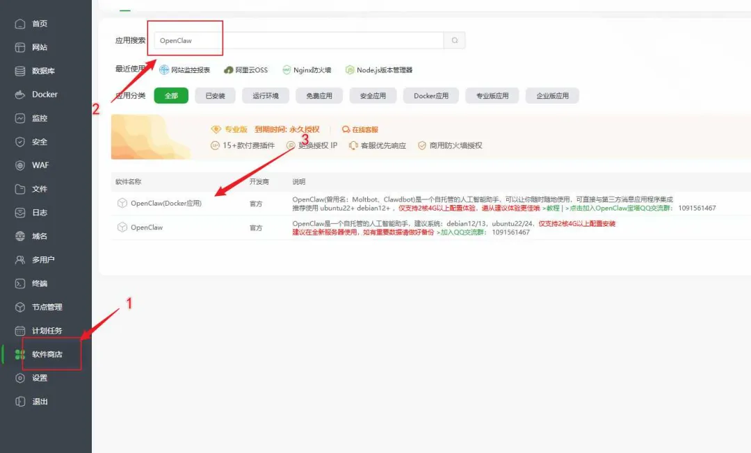3. 找到 OpenClaw(Docker应用) ,点击安装