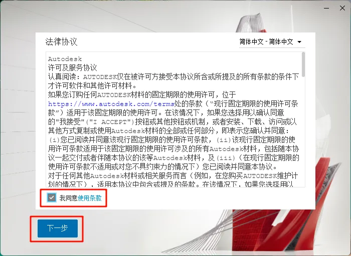 5.勾选【我同意使用条款】,然后点击下一步