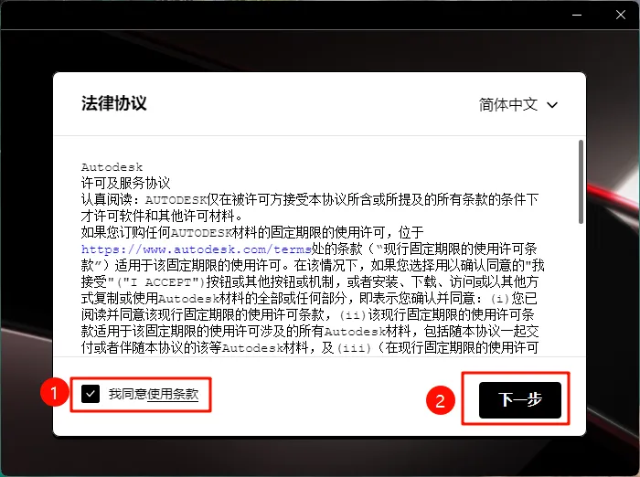 5.勾选【我同意使用条款】,然后点击下一步