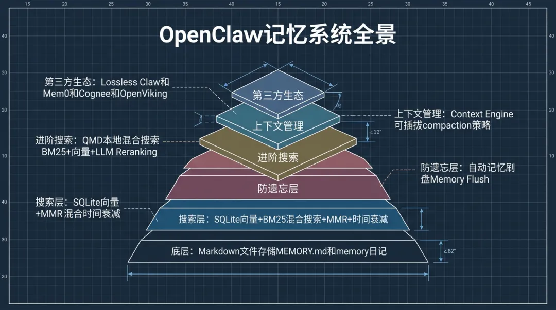 这篇文章拆解OpenClaw记忆系统的完整链路——从最底层的文件存储,到搜索引擎的向量+关键词混合检索,到防遗忘的自动刷盘机制,到QMD本地混合搜索引擎,再到第三方记忆体的开源生态。一层一层往上叠,看你的Agent需要哪一层。