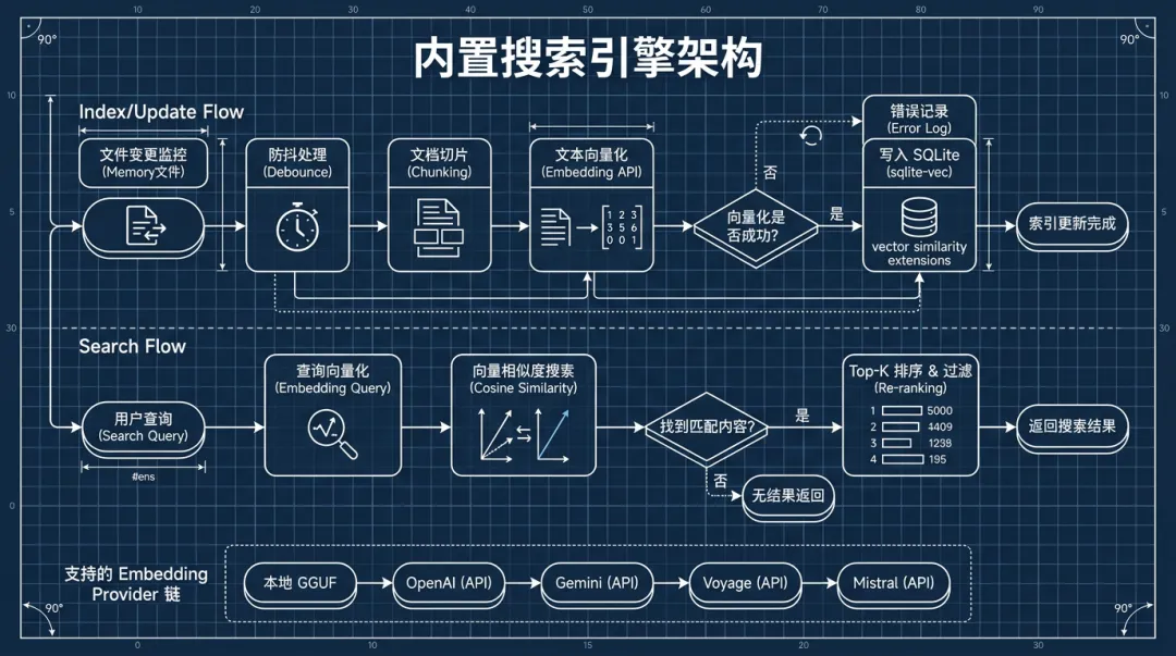 默认的本地embedding模型是embeddinggemma-300m-qat-Q8_0.gguf,大约0.6GB,首次使用自动下载。用node-llama-cpp在本地跑推理,不需要云端API,零成本零泄露。
