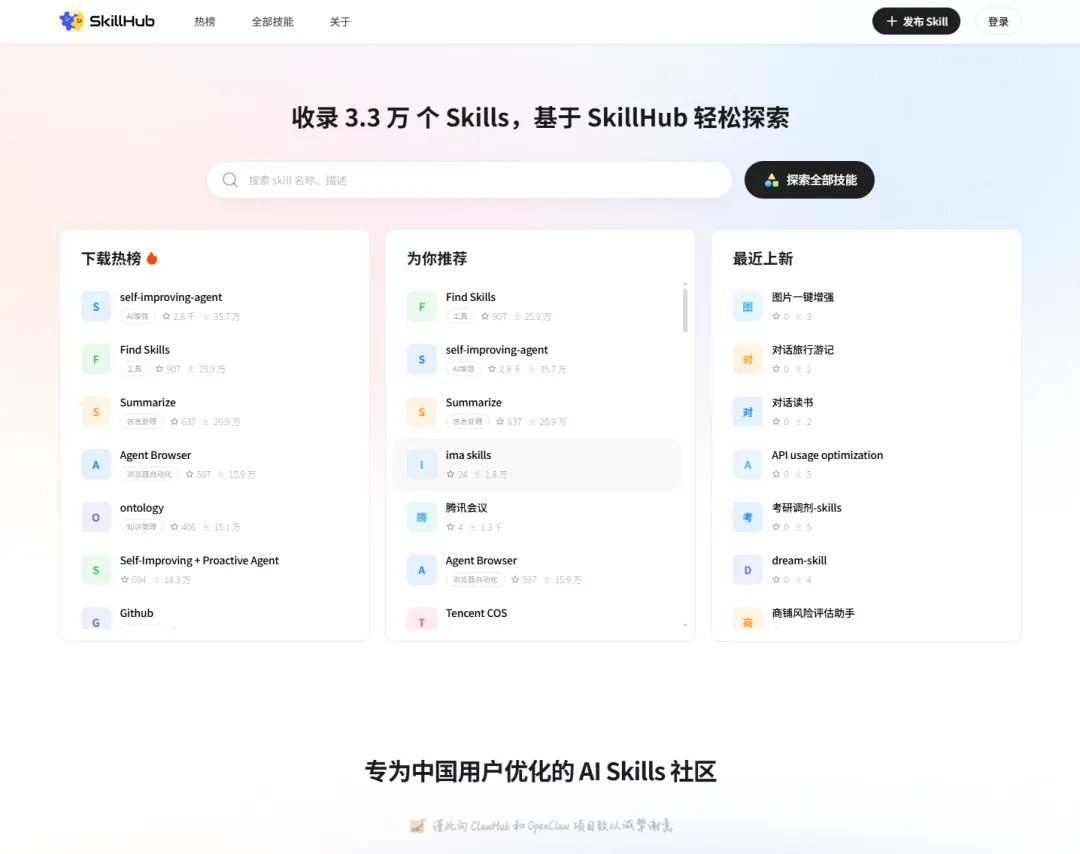 其实之前腾讯已经有一波操作来解决这个问题。三月初的时候,腾讯抓取了ClawHub上的技能数据,导入到自己的AI技能应用商店SkillHub里。