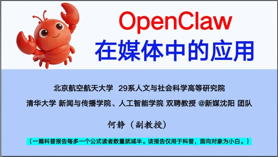 清华大学·新媒沈阳·何静副教授最近发布了一份技术报告《OpenClaw在媒体中的应用》。