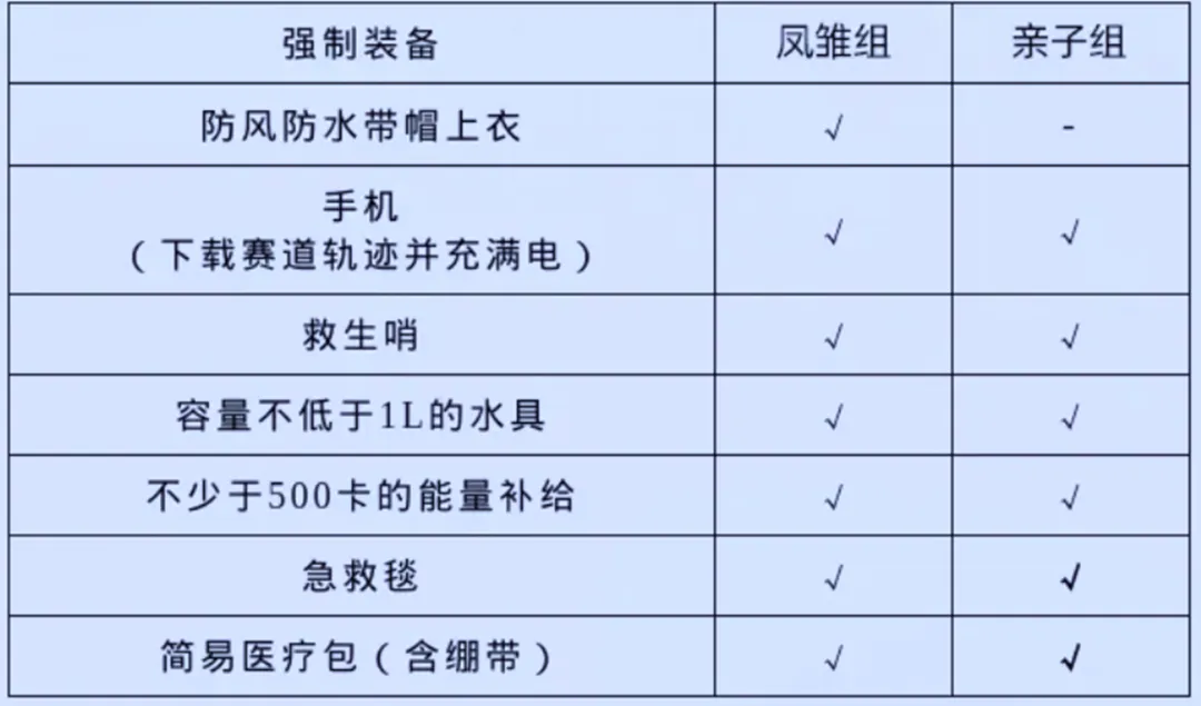3、参赛选手必须全程携带各项强制装备,组委会将在出发检录处进行强制装备检查,在赛道中和比赛终点进行强制装备抽查,在任一检(抽)查点位发现未携带任一强制装备的参赛选手将被强制退赛(或取消成绩)。