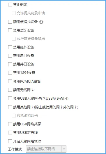 安企神装上后,小李把所有USB存储设备都设成了“只读”或者“禁用”。员工自己的U盘插上去没法用,想拷文件得找小李审批。移动硬盘、手机USB共享网络、无线网卡,统统被管住了。