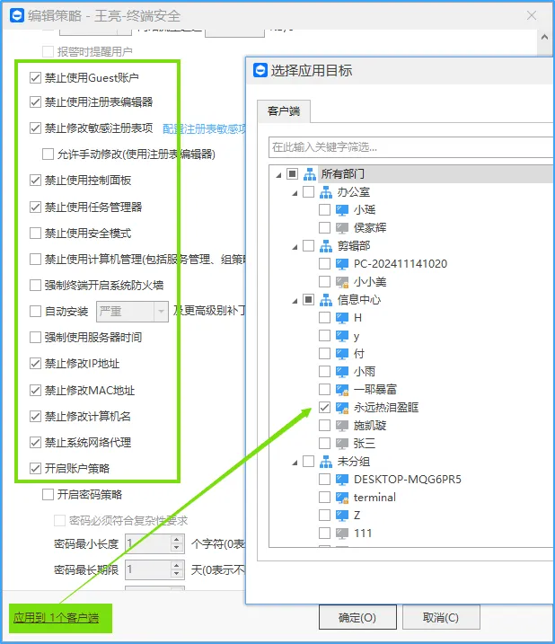 安企神可以统一管控这些权限。小李在后台勾了几个选项:禁止修改IP地址、禁止修改计算机名、禁止使用注册表编辑器、禁止打开控制面板。