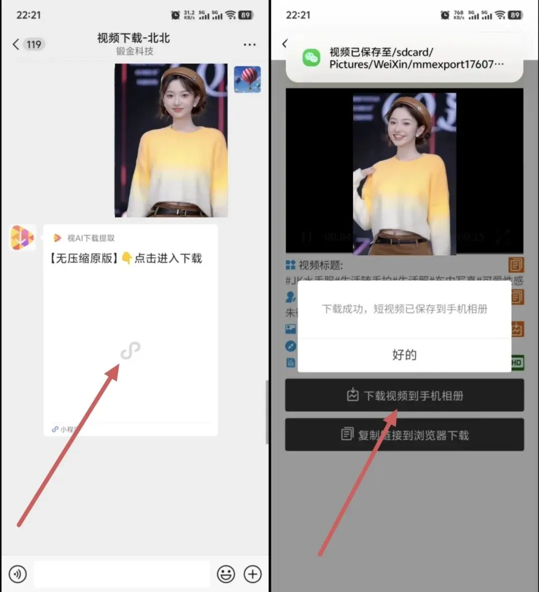 ② 机器人会自动解析,返回下载小程序。 👉 进入小程序,一键下载到手机相册!