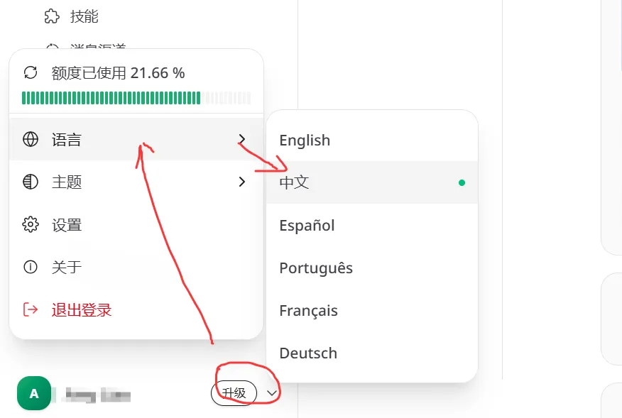 把后台设置成中文后台:点击左下角 头像-> Settings-> Language -> 中文
