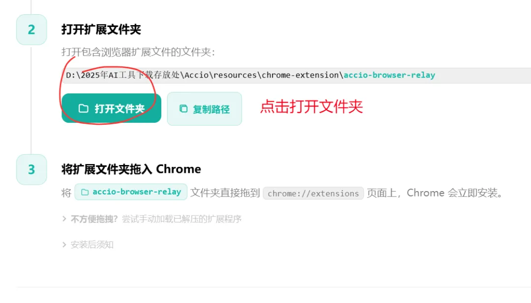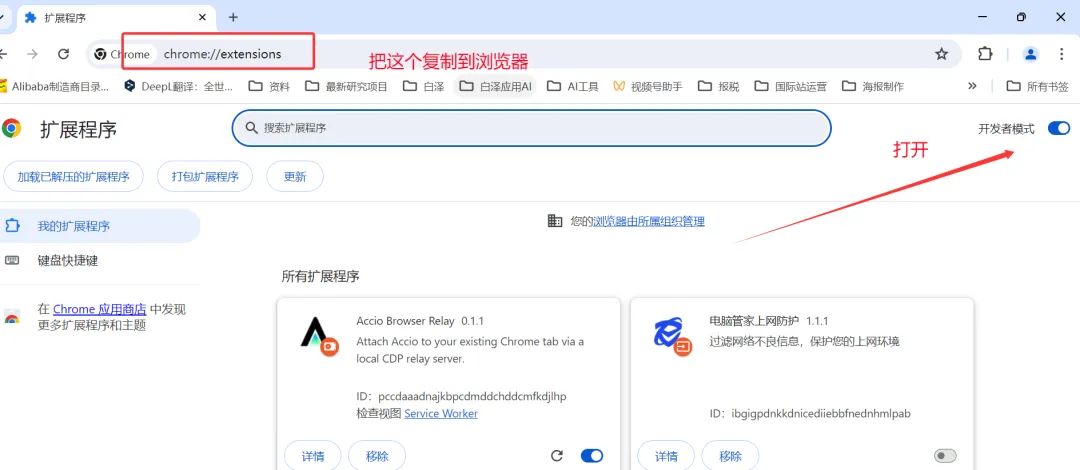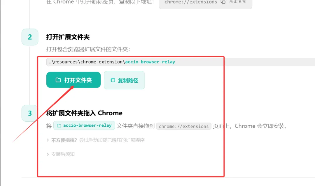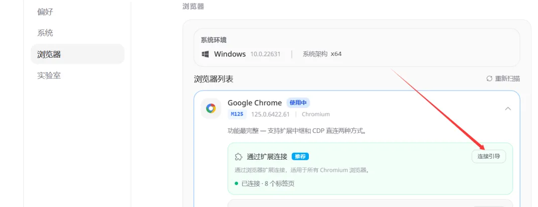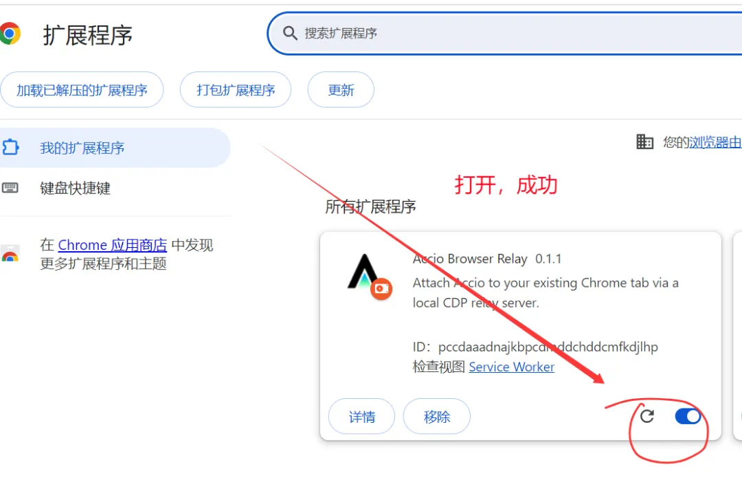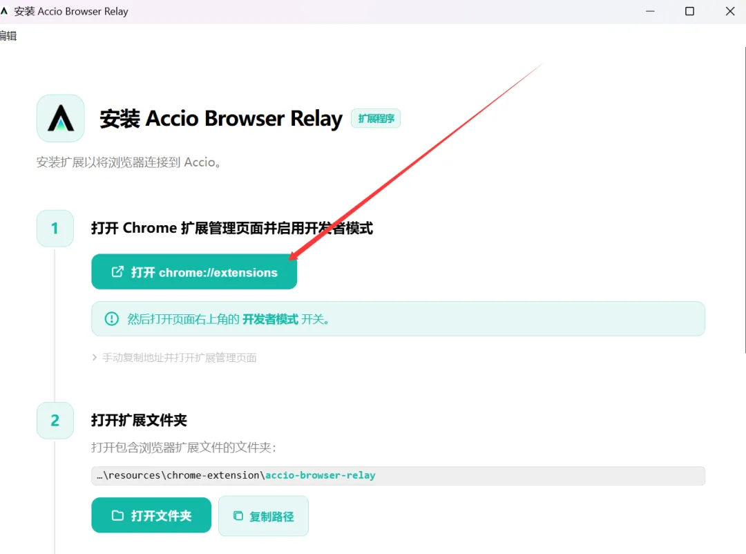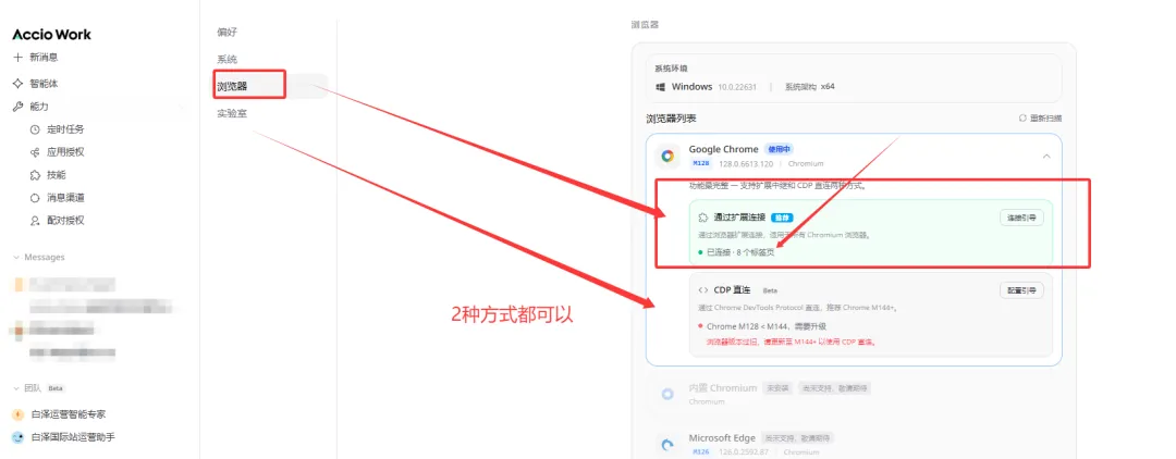 第四步,把Accio 和你的谷歌浏览器建立连接,这样Accio work 就可以直接操控浏览器去帮你看店铺,发产品,诊断等工作了。
