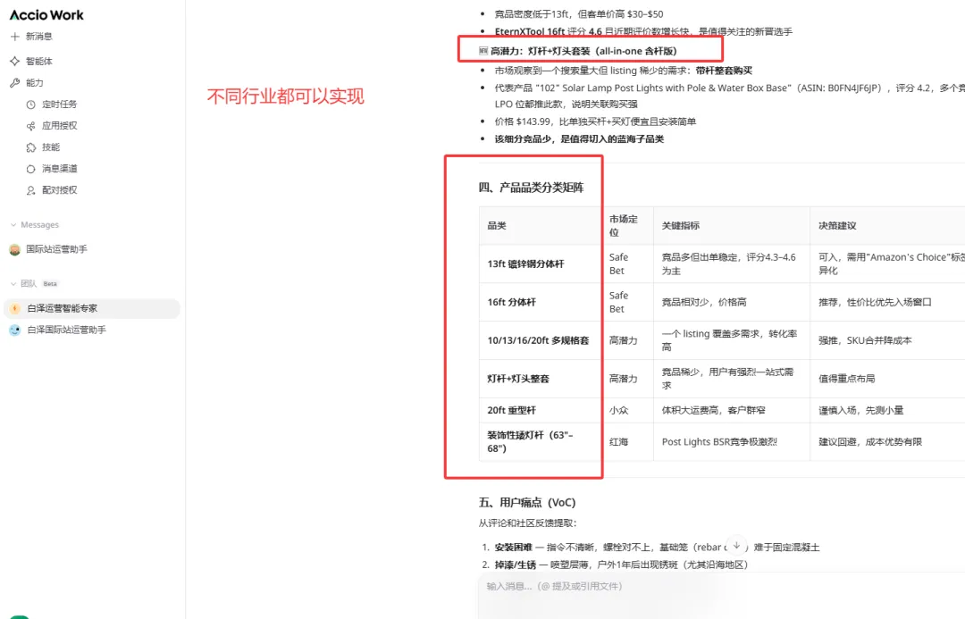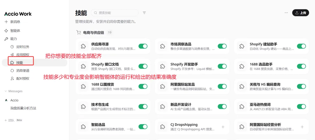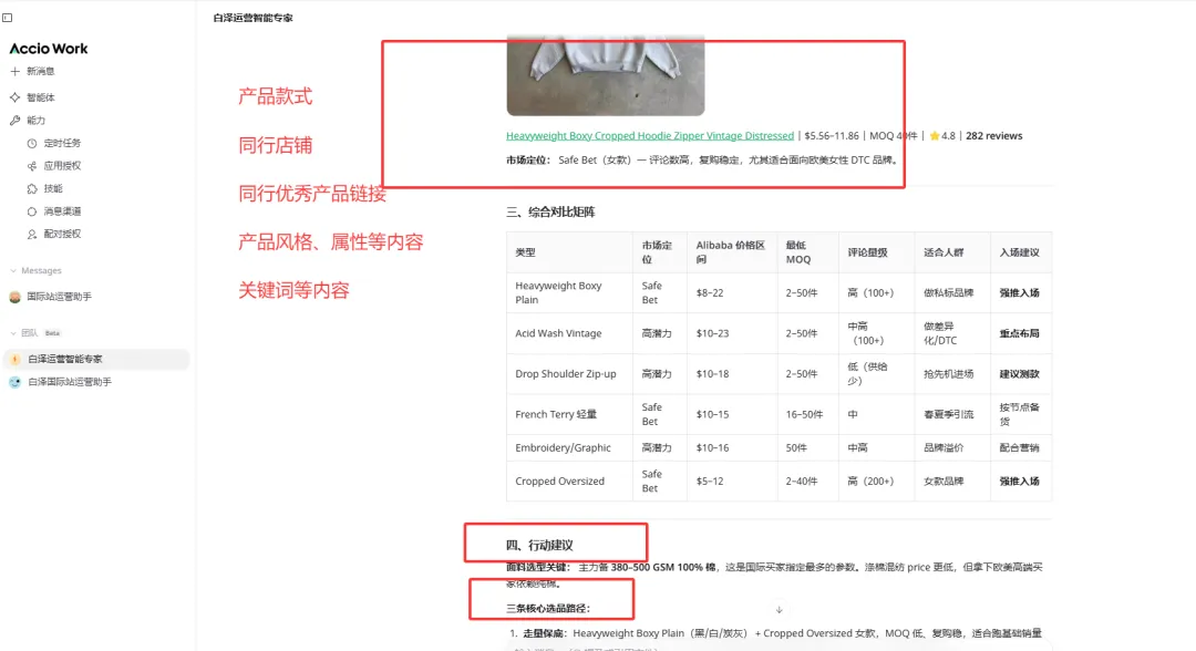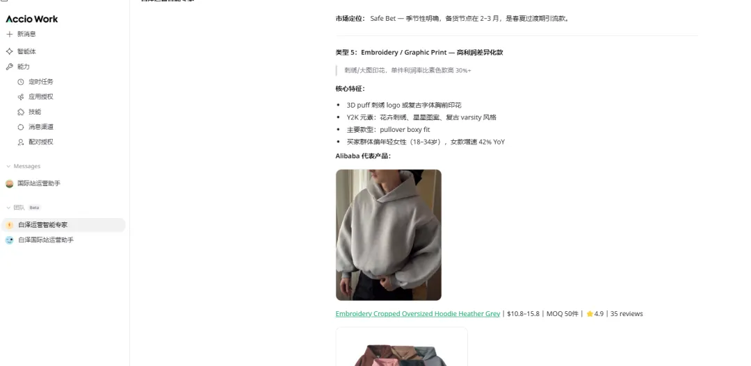 我在Accio work 上先打开一个智能体,先选1个电商专家智能体,可以配上各种技能,然后开始用提示词来获取产品和同行的信息以及市场趋势的信息。