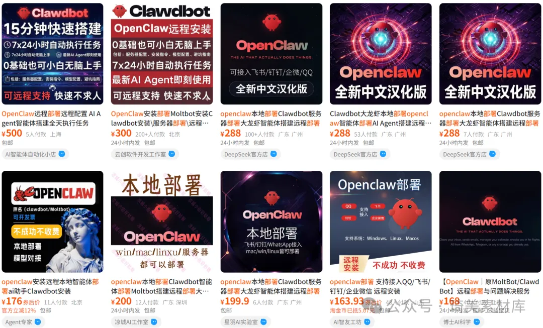 目前各类平台上,已出现大量提供OpenClaw上门及远程安装调试的服务,其中远程安装服务定价300元,上门安装调试服务定价500元,高端定制类服务则以1000元为起售价。
