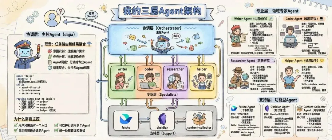 ┌─────────────────────────────────────────────┐│ 协调层(Orchestrator) ││ 主控Agent │├─────────────────────────────────────────────┤│ 专业层(Specialists) ││ writer │ coder │ researcher │ helper │├─────────────────────────────────────────────┤│ 支持层(Support) ││ feishu │ obsidian │ content-collector │└─────────────────────────────────────────────┘协调层:主控Agent(dajia)