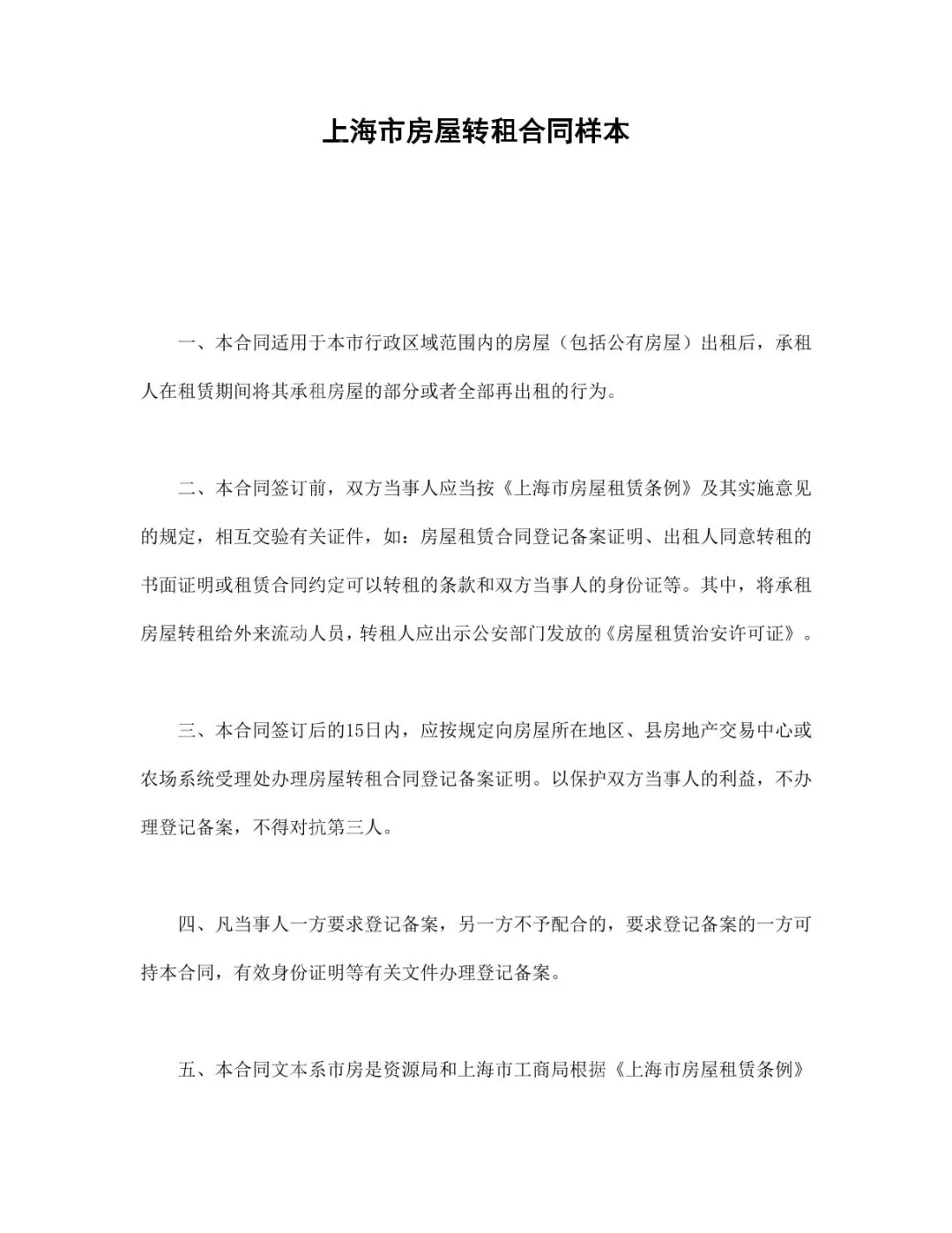 本样本为上海市官方房屋转租合同模板,含转租备案、租期、租金、责任划分等合规条款,适用于本市行政区域内房屋转租场景,指导双方规范签订转租合同。
