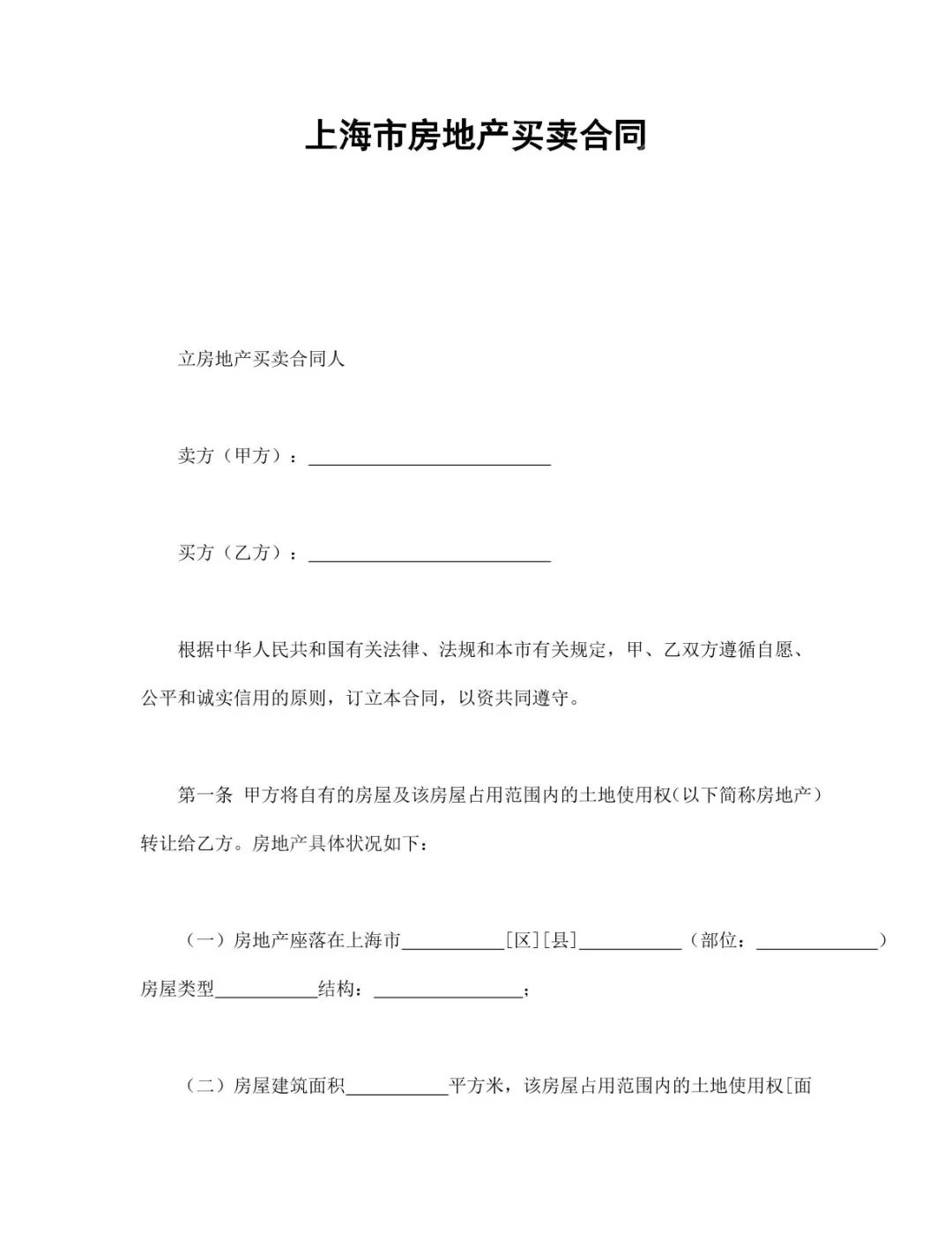 本文件为上海市房地产买卖合同标准范本,涵盖房产转让详情、价款支付、交付约定、违约责任等核心条款,适用于上海地区房产交易双方签订使用。