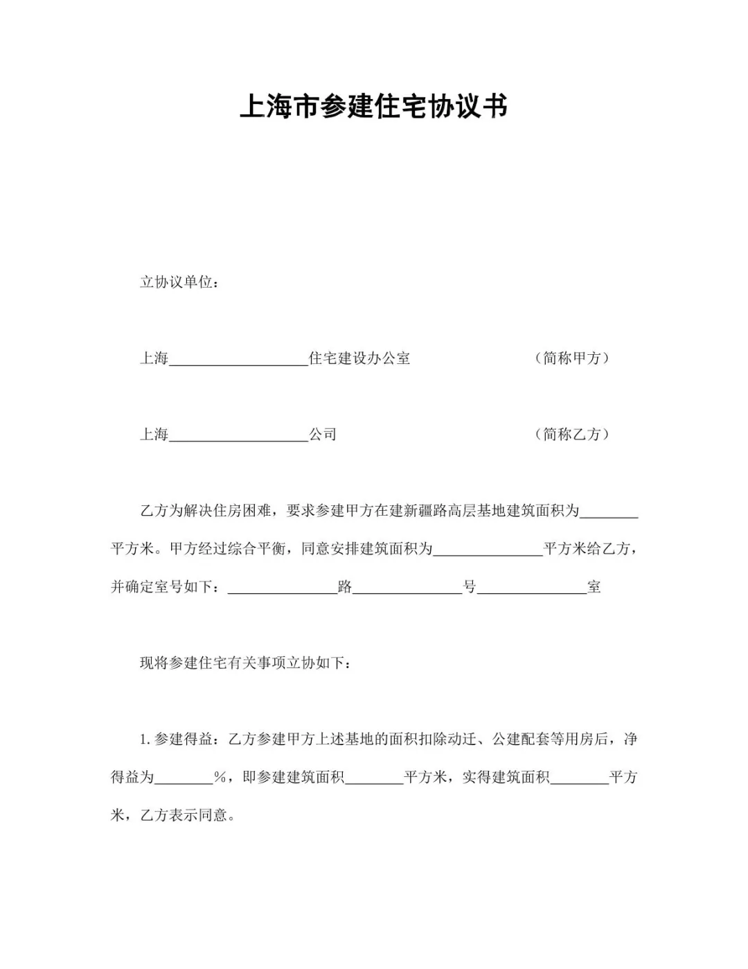 本协议为上海市参建住宅官方范本,明确甲方住宅办与乙方公司参建新疆路高层住宅的面积、付款、房源交付及产权等核心事项,为参建住宅提供合规依据。
