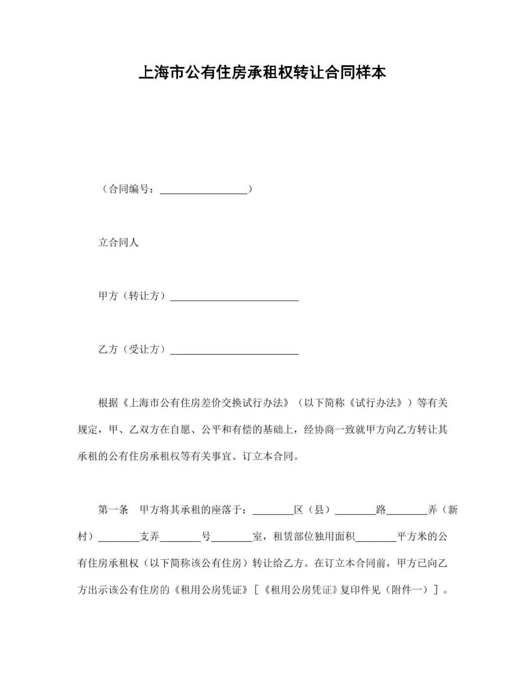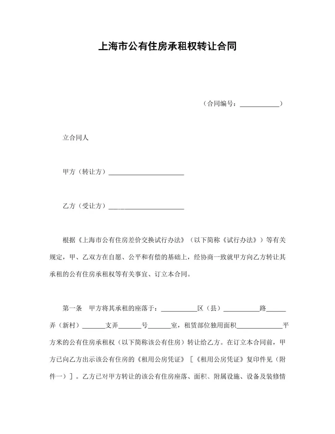 本合同为上海市公有住房承租权转让专用范本,依据《上海市公有住房差价交换试行办法》制定,明确转让方与受让方权利义务,规范转让流程、价款、交割及争议解决等事宜。