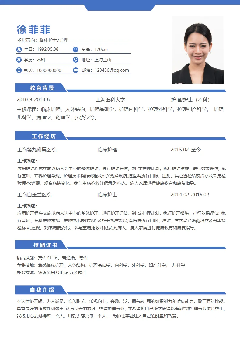 蓝色简约护理护士医生个人简历模板