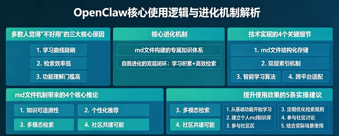 OpenClaw作为一款AI Agent框架,被不少人诟病“不好用”,实则多为使用姿势不当所致;其越用越好用的核心本质,并非框架本身的智能迭代,而是依托以Markdown(md)文件为核心的知识沉淀、检索与自我进化机制,通过持续的md文件读写循环,让Agent形成专属的私人化知识体系。以下是其核心逻辑、技术细节与实操建议的精炼解析: