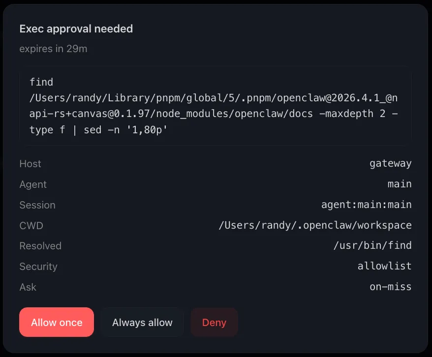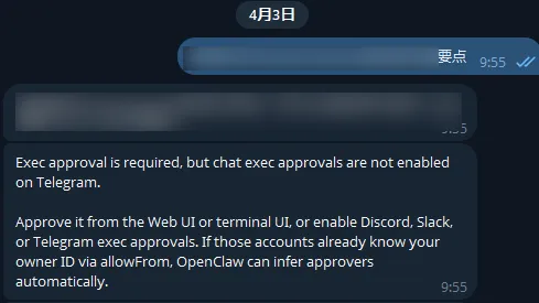 在通过某软件与我的龙虾对话时遇到了如图上的问题,大概意思是需要进行审批,但是该软件暂未启动聊天执行审批的功能呢;